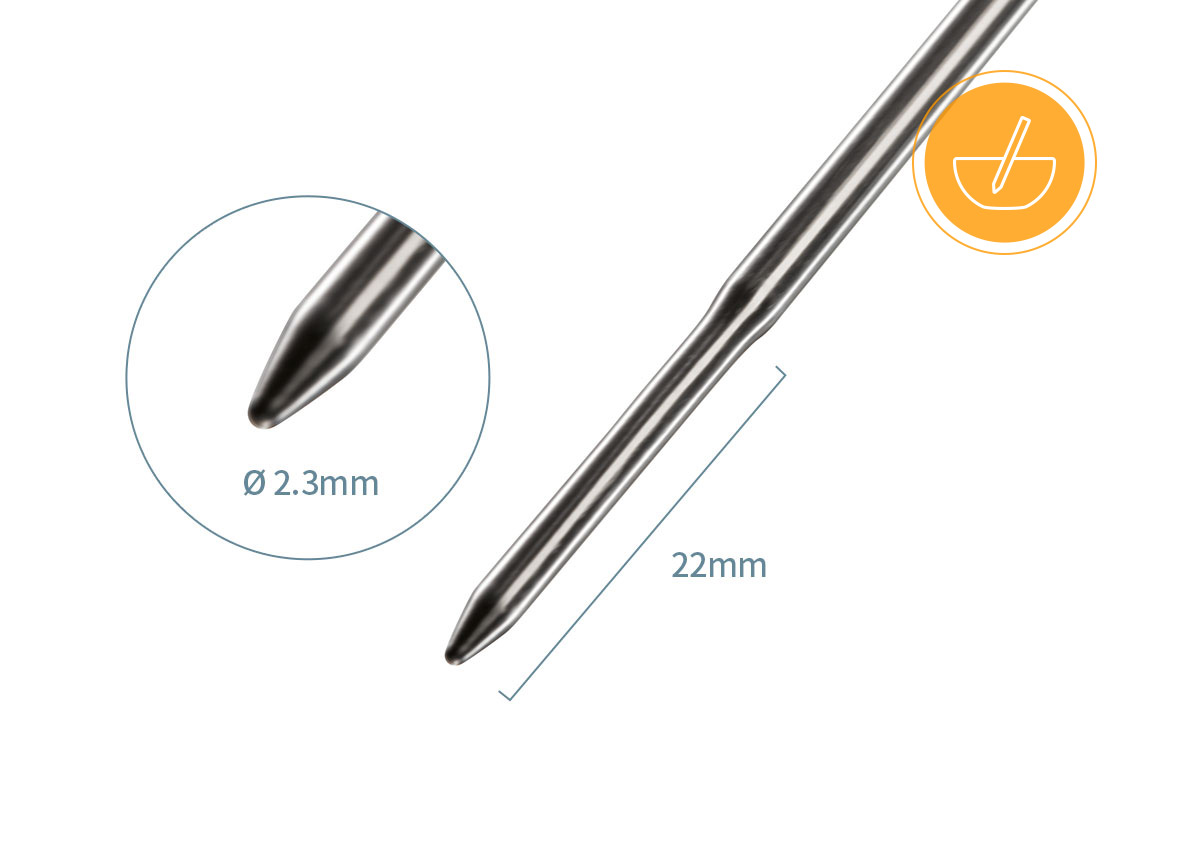 Ø 2.3mm의 아주 얇고, 견고한 측정 팁은 식품에 어떤 흔적도 남기지 않은 채로 측정이 가능하도록 도와줍니다.