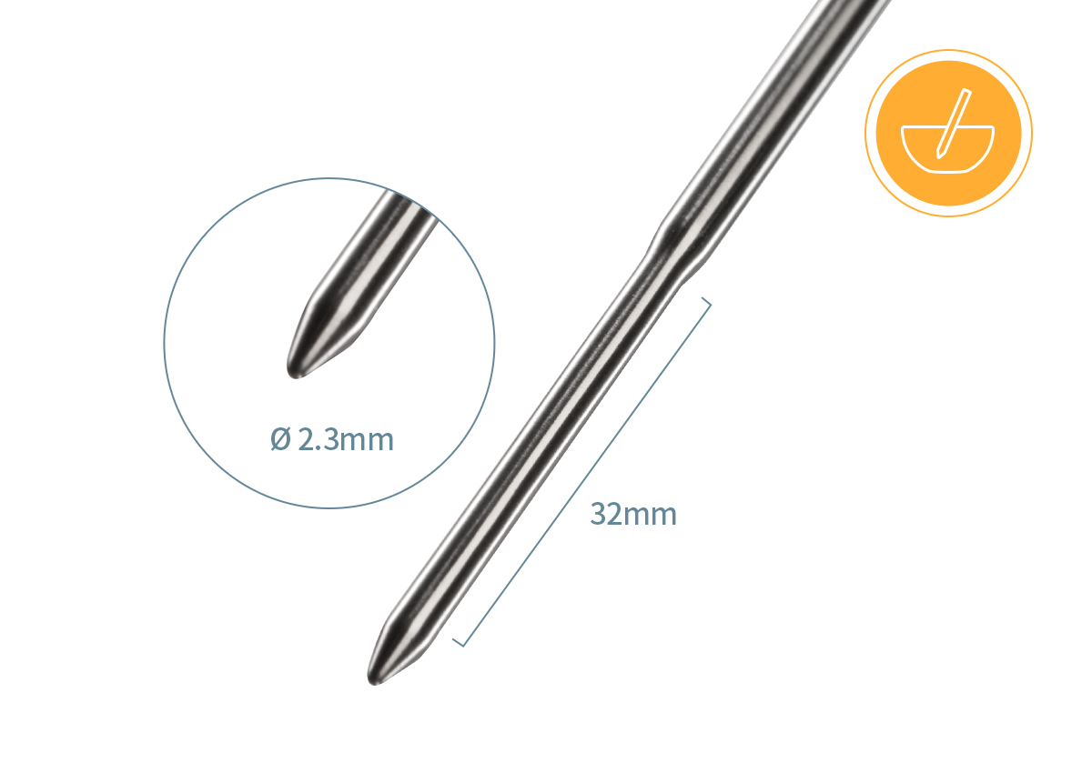 Ø 2.3mm의 아주 얇고, 견고한 측정 팁은 식품에 어떤 흔적도 남기지 않은 채로 측정이 가능하도록 도와줍니다.