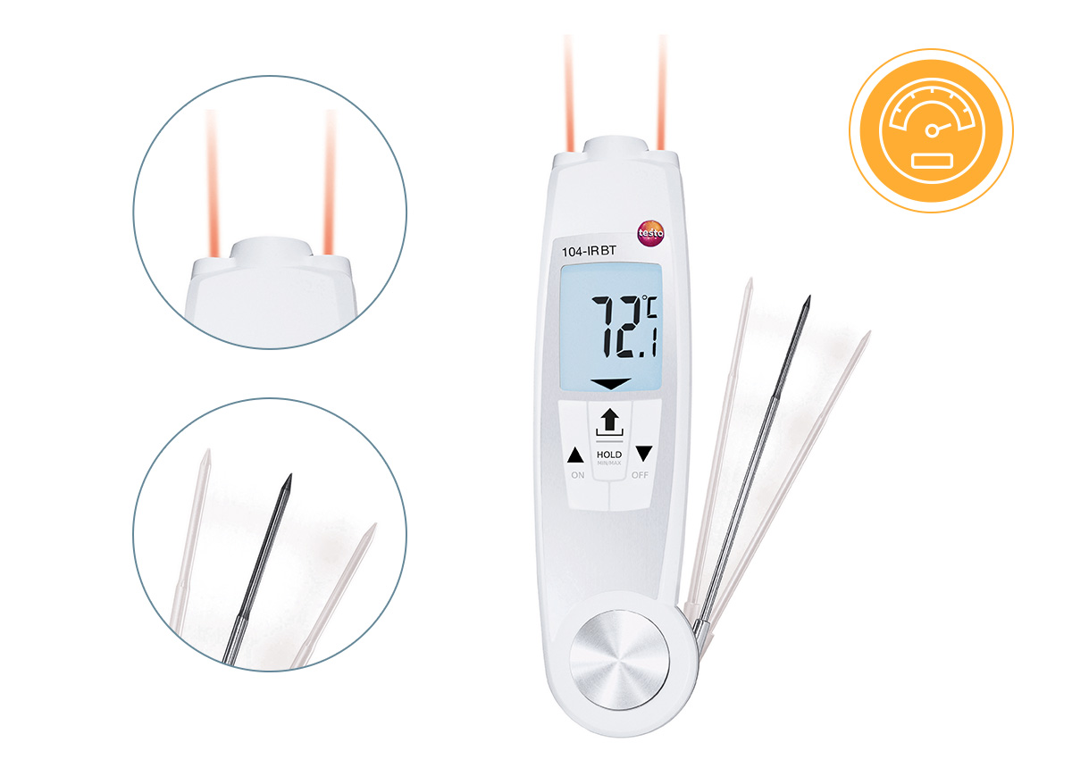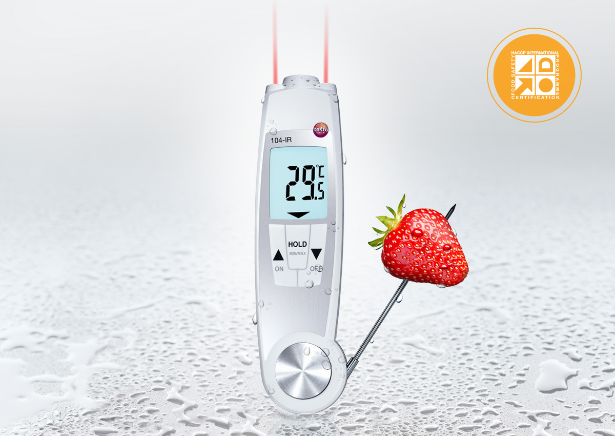 방수 적외선 탐침 온도계 testo 104-IR은 HACCP 인터내셔널의 인증을 획득한 온도계로 식품분야에서 이상적인 사용이 가능합니다.