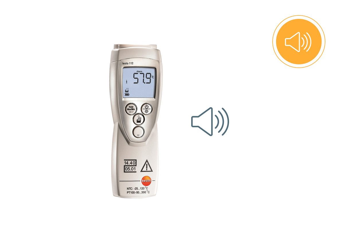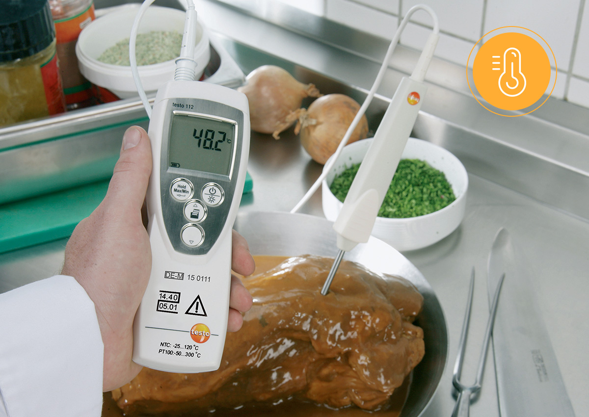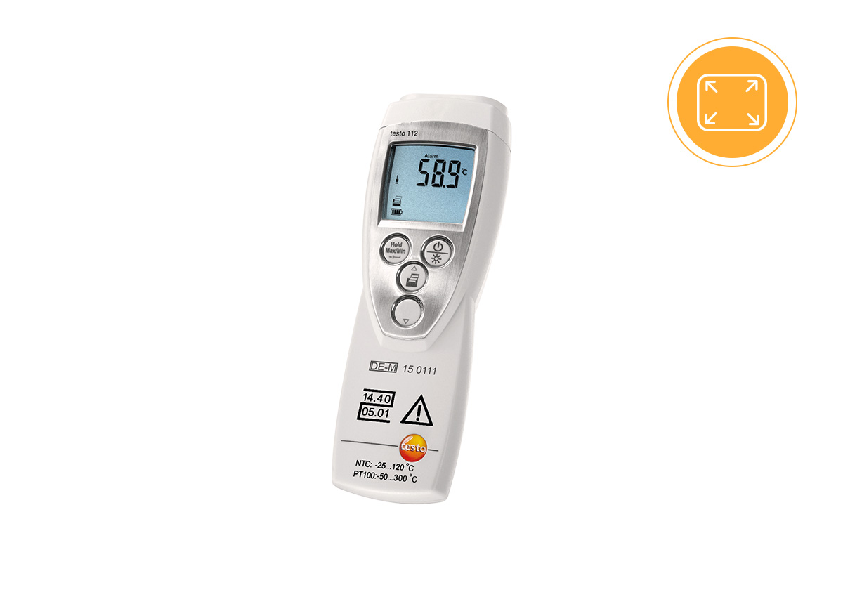 식품 검수용 1채널 온도계 testo 112는 NTC 또는 Pt100 프로브를 1개까지 연결하여 온도를 측정할 수 있습니다. 이러한 온도 프로브는 냉동 식품부터 기름의 온도까지 광범위한 식품 온도 측정이 가능합니다.