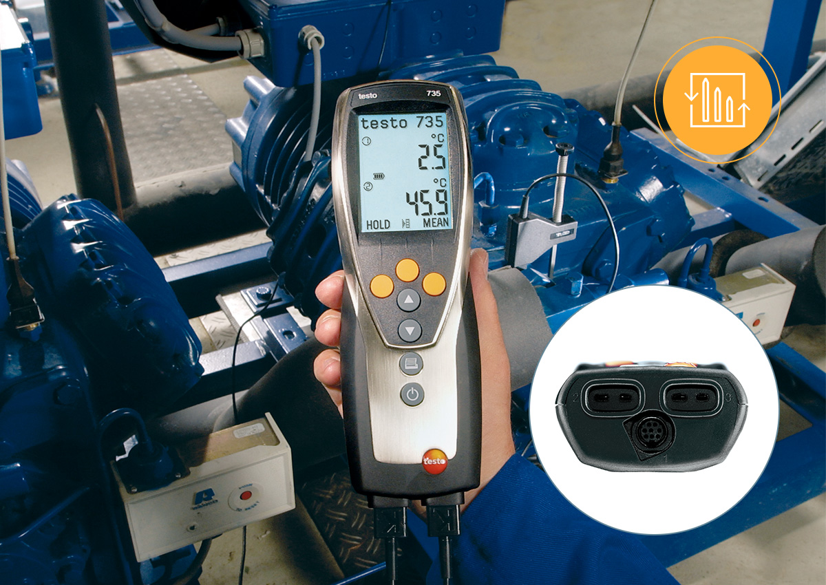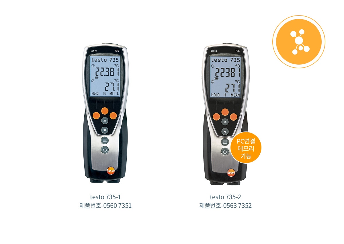 기준급 온도계 testo 735는 2가지의 라인업으로 구성되어 있습니다. testo 735-2는 최대 10,000개의 측정값을 저장할 수 있습니다. 저장한 측정 데이터는 전용 PC 소프트웨어를 이용해 분석하고, 보고서로 만들 수 있습니다.
