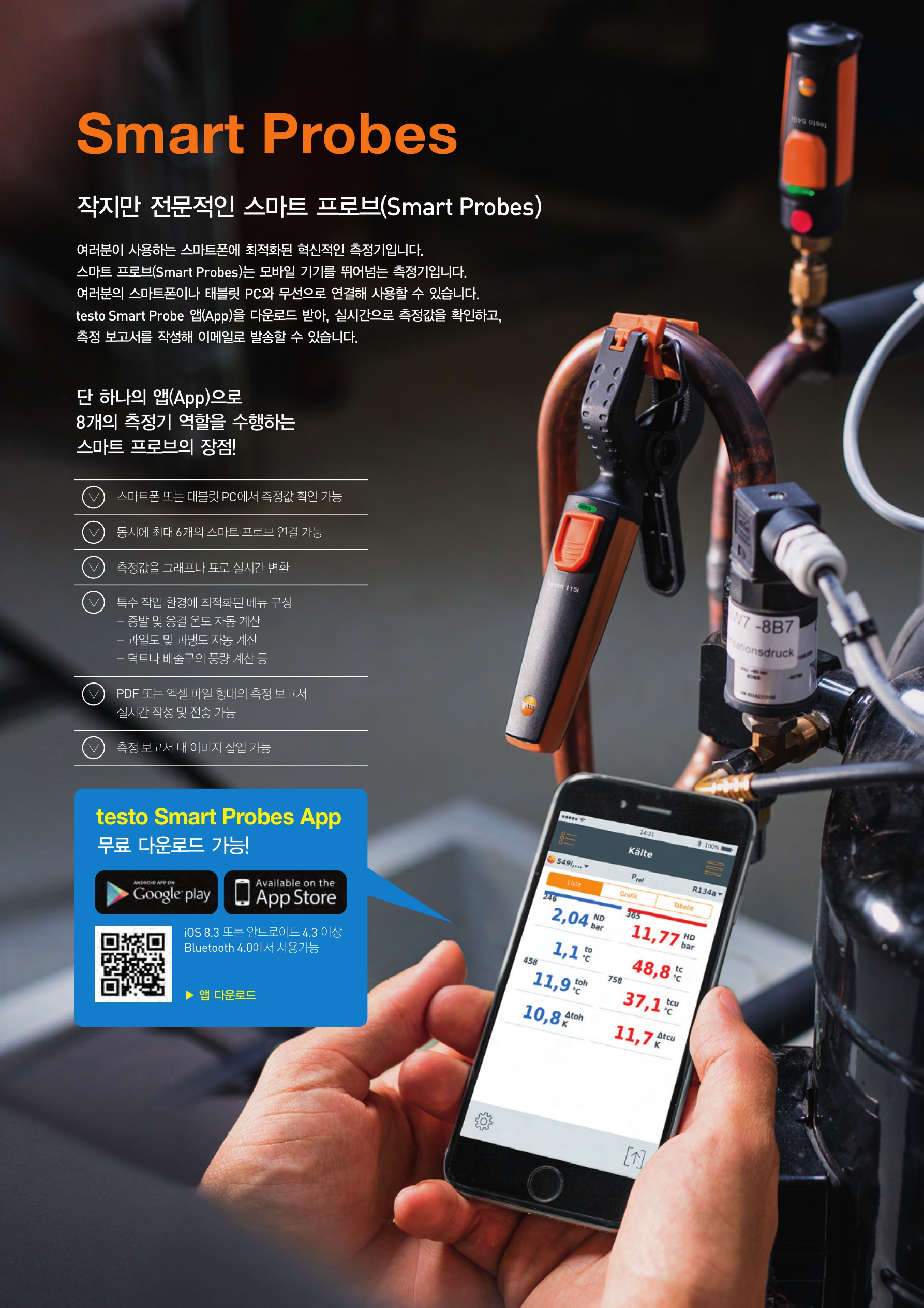 강력한 testo Smart App(앱)은 누구나 쉽게 사용할 수 있습니다.최대 6개의 스마트 프로브의 측정값을 읽을 수 있으며, 결과물에 대한 보고서 작성도 용이합니다.