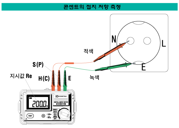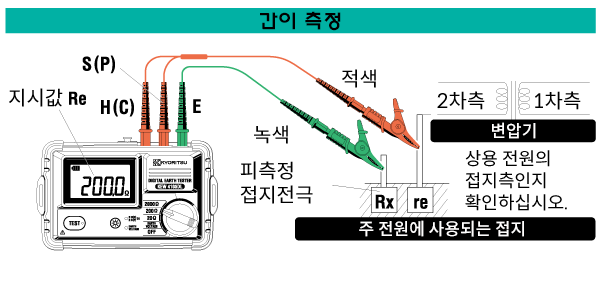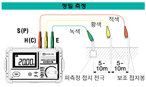 이 측정은 2개의 보조 접지 전극을 사용하여 접지 저항을 측정하는 전위 강하법으로써, 본 제품은 이 방식을 사용하는 접지 테스터입니다.